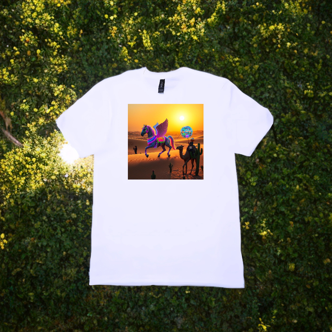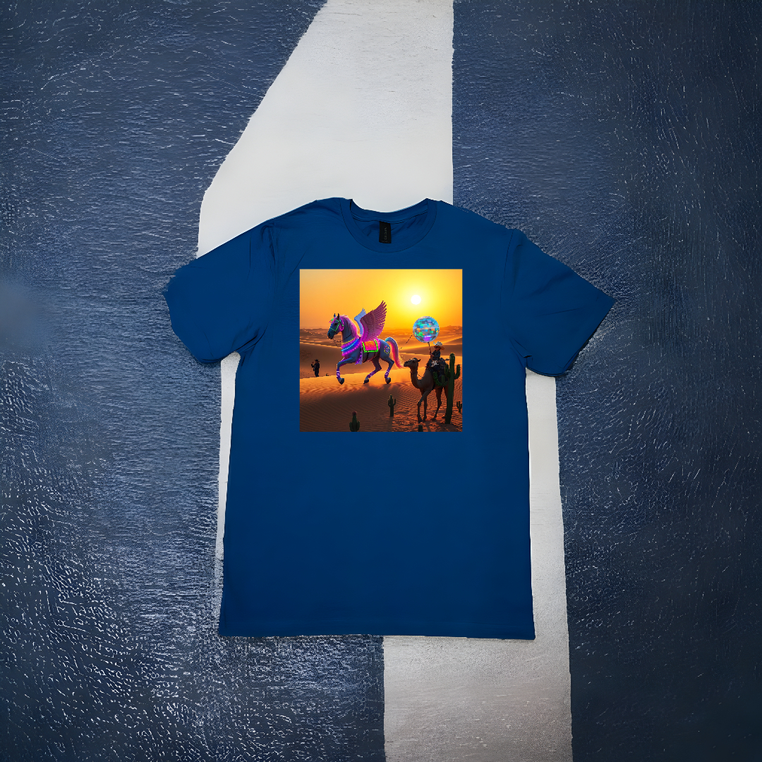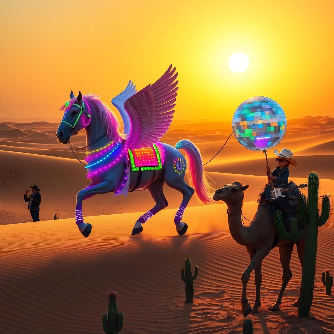 Egy hely, ahol a 80-as évek neonja találkozik az AI-generálta sivatagi legendákkal – és abból születik meg a Discorealm Nomadicorn. Egy futurisztikus pegazus, holografikus textúrával, diszkógömbbel a háta mögött, egy digitális cowboy kíséretében, aki a zene és fény útját követi – mindezt egy AI álmodta sivatagi végtelenbe.