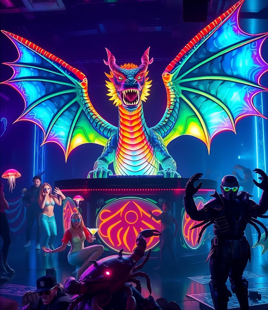A Neon Dragon Bassline az a pillanat, amikor a mitológia átveszi az irányítást a keverőpult felett. Ez a desAIgn egy digitális szertartás: egy ősi bestia, amely nem lángokat, hanem basszust okád a tömegre, miközben pikkelyei a rave fények minden színében pulzálnak. A táncparketten a valóság szabályai feloldódnak a hanghullámokban, és a parti résztvevői – a neon rákoktól a táncoló alakokig – mind egyetlen, közös ütemre mozognak. Ez nem egy szimpla buli; ez egy találkozás egy olyan erővel, amit csak a legnagyobb hangfalak képesek megidézni.