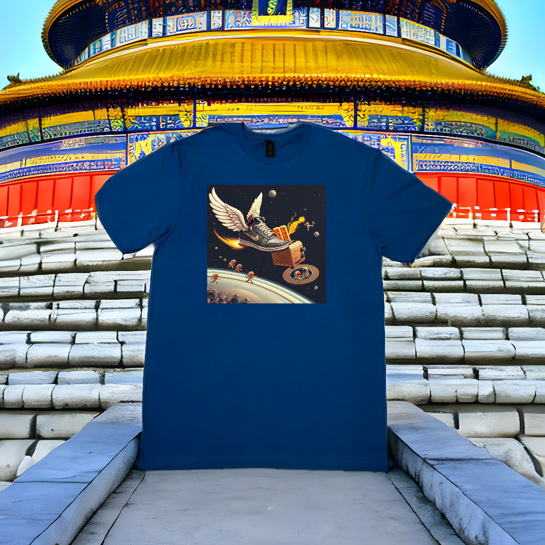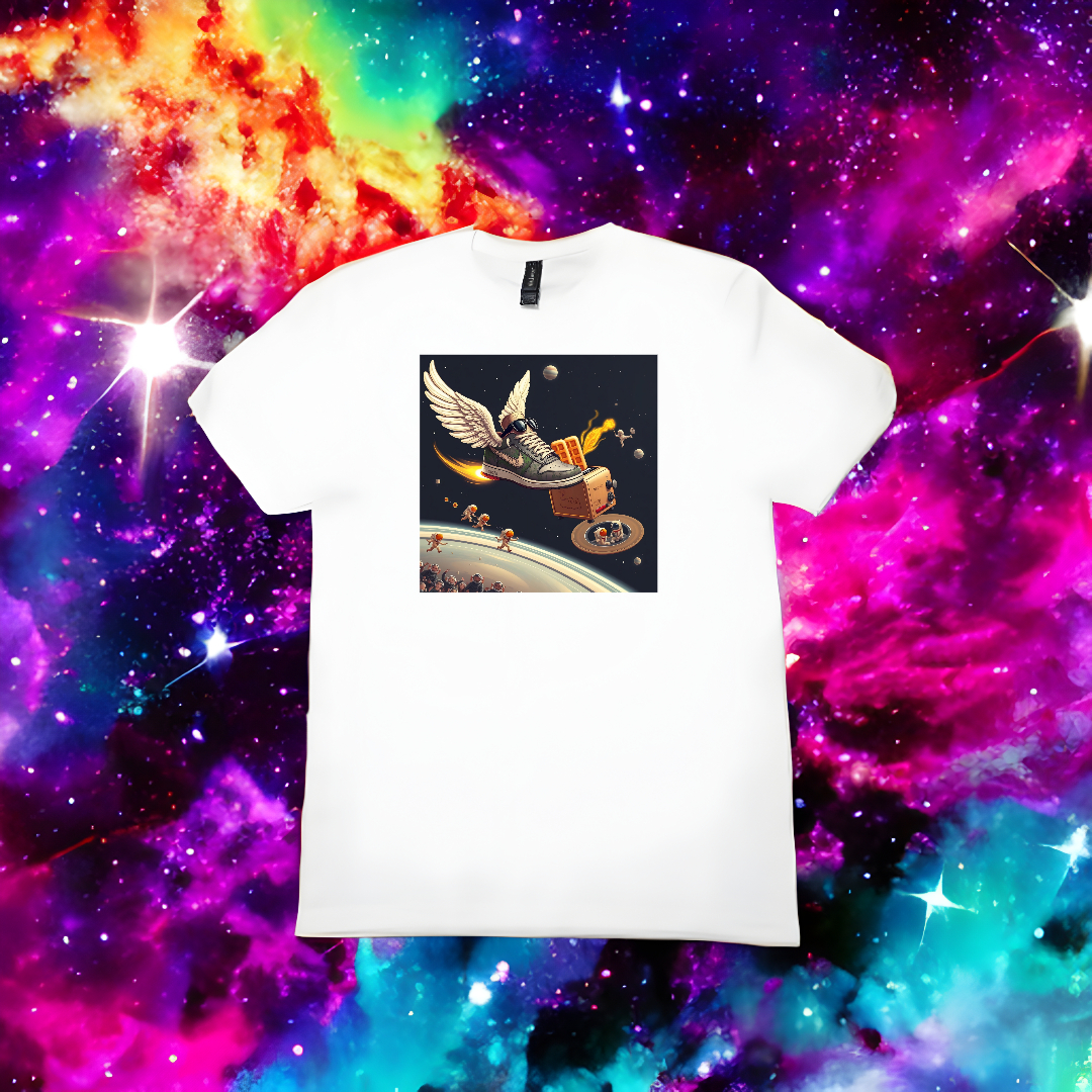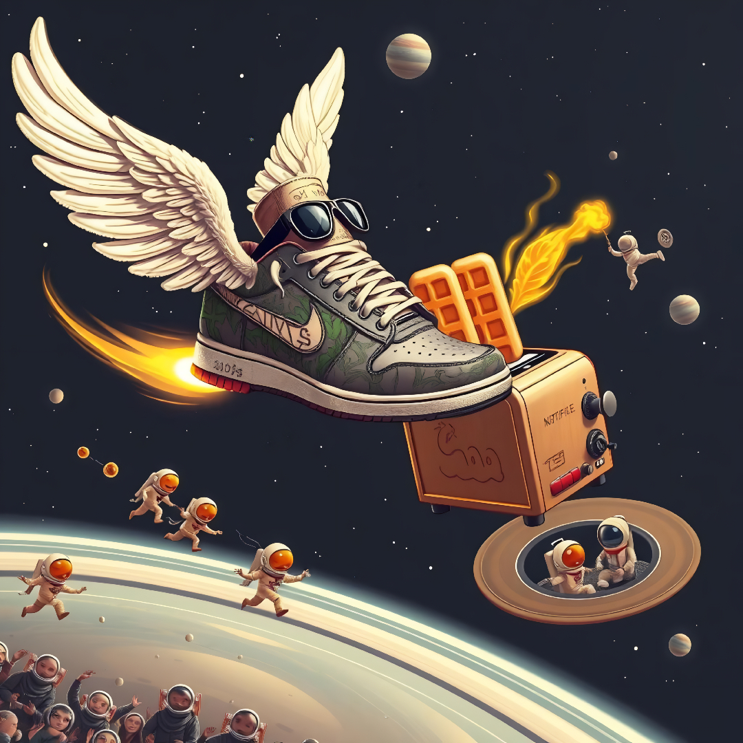szárnyas sneaker napszemüvegben szeli át a kozmoszt, miközben egy pirítóskészülék rakétahajtóművé válik, asztronauták pedig pánikszerű kíváncsisággal követik az eseményeket.